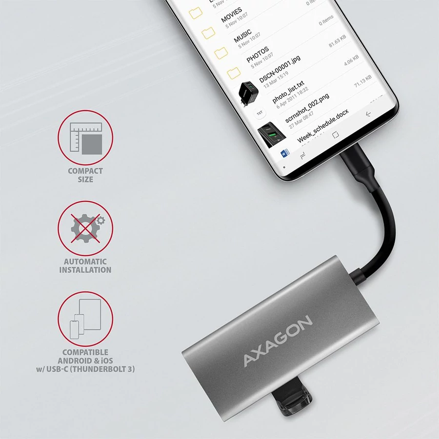 Az USB-C hub ideális kiegészítő USB-A csatlakozók nélküli laptopokhoz, például a MacBook Pro. Használhatja meglévő USB-perifériáit anélkül, hogy újakat kellene vásárolnia. A Plug and Play és a Hot Plug funkcióknak köszönhetően maga a hub csatlakoztatása nagyon egyszerű, az nem szükségel bonyolult telepítést. A perifériák egyszerűen csatlakoztathatók és leválaszthatók a számítógép működése közben is. Az hub gond nélkül csatlakozik az USB-C csatlakozóval rendelkező telefonokhoz - és például csatlakoztathat egy flash meghajtót, billentyűzetet vagy egeret is a telefonhoz.