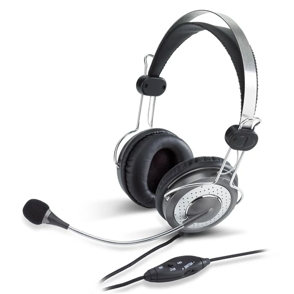Fejpántos, mikrofonos fejhallgató, hangerőszabályzóval és mikrofonba szerelt zajszűrővel.