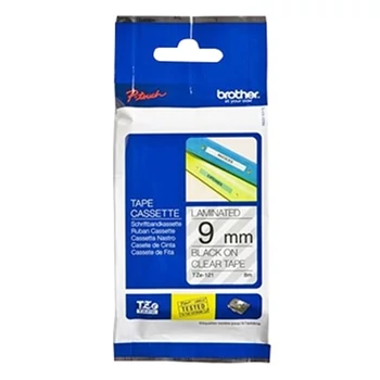 Feliratozógép szalag, 9 mm x 8 m, BROTHER, "TZe-121" víztiszta-fekete