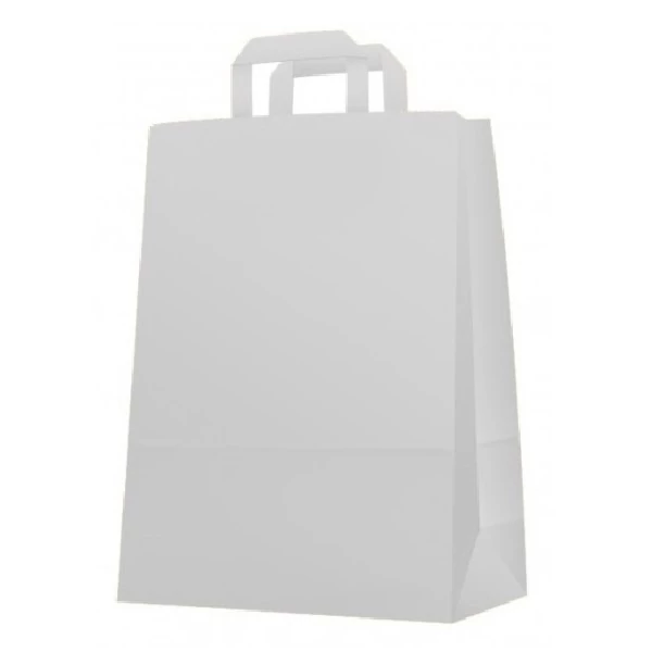 Szalagfüles papírtáska, fehér színű papírból. Mérete: 260 x 2 x 60 x 350 mm. Minimum megvásárolható mennyiség: 50 db.