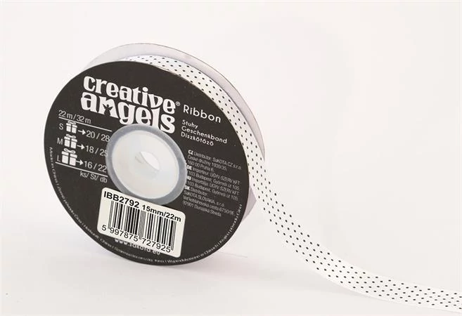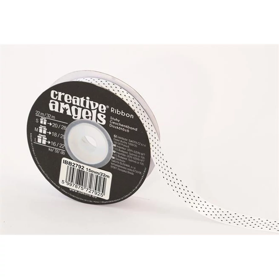 Szatén szalag, 15 mm x 22 m, fehér fekete pötyökkel