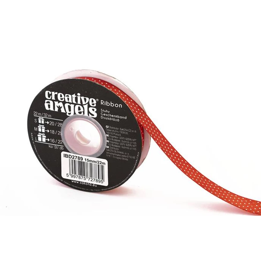 Szatén szalag, 15 mm x 22 m, piros fehér pötyökkel