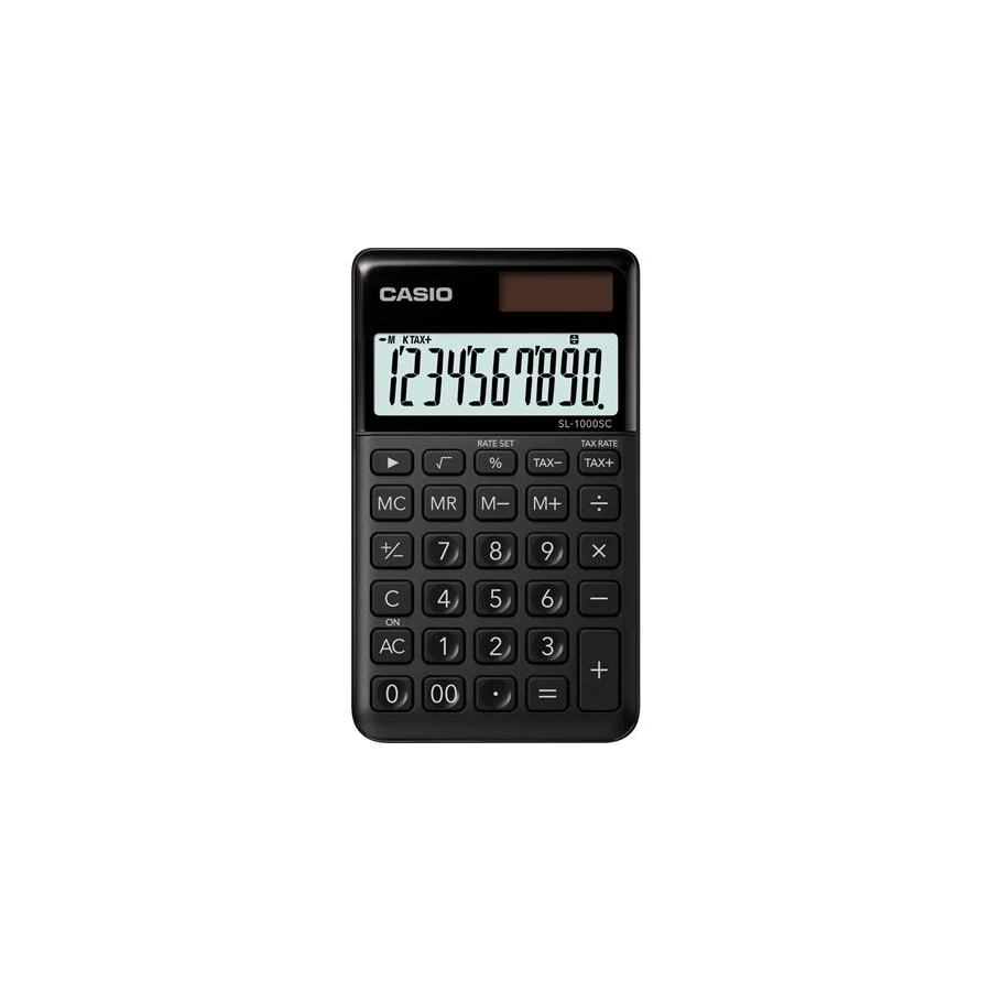 10 számjegyű, NAGY KIJELZŐ, "stylish design" sorozat, elem+napelem, %, árrés számítás, ÁFA számítás, memória, +/-, 00, utolsó számjegy javítása, gyökvonás, FEKETE