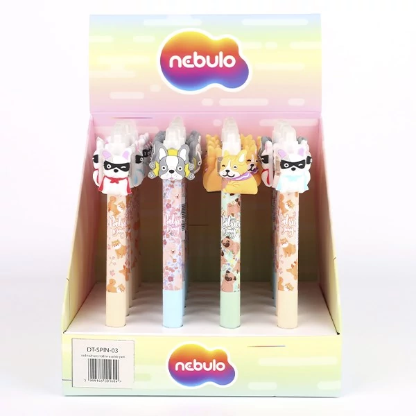 Zselés toll nyomógombbal, pörgethető figurával. Speciális tintája a tollvéggel radírozható, de az írás -18 C alatt újra megjelenik. Írásvastagság 0,7 mm. Írásszín kék.